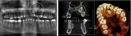 Slight shadow can be seen in the panoramic image. In the 3Dimage (MPR:Cpronal), the state of the eruption and the position of the maxillary impacted canine tooth can be accurately evaluated. Further detailed information can be obtained in the image of 3D VR.