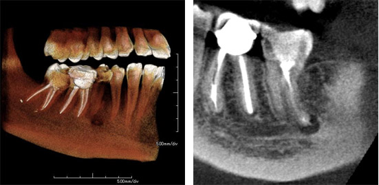 The regular 2D x-ray image suggests a possible issue with an endodontic treatment. However, it is not sufficient for a clear diagnosis. The sagittal image of the 3D CBCT scan reveals a root facture.