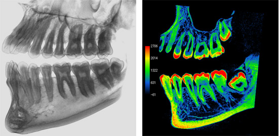 Both upper and lower molars more extensively evaluated for position, number of root canals and also the distance near the inferior alveolar canal if extractions are planned. Rotational and multi-slice features aid greatly and especially with deep or curved roots.