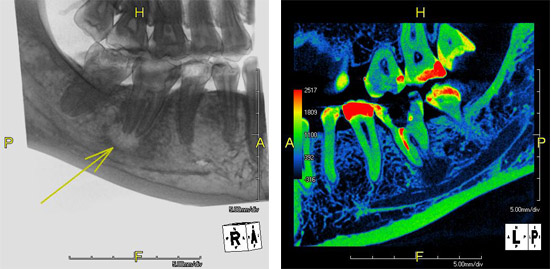 Whatever the cause of root abscess be it from root canal failure , implants, etc... the PreXion3D scanner can evaluate and note the extent and involvement of surrounding anatomy and help plan the course of treatments to recommend. Liquified or purulent dense matter within abscess can be seen via the cone beam CT images.